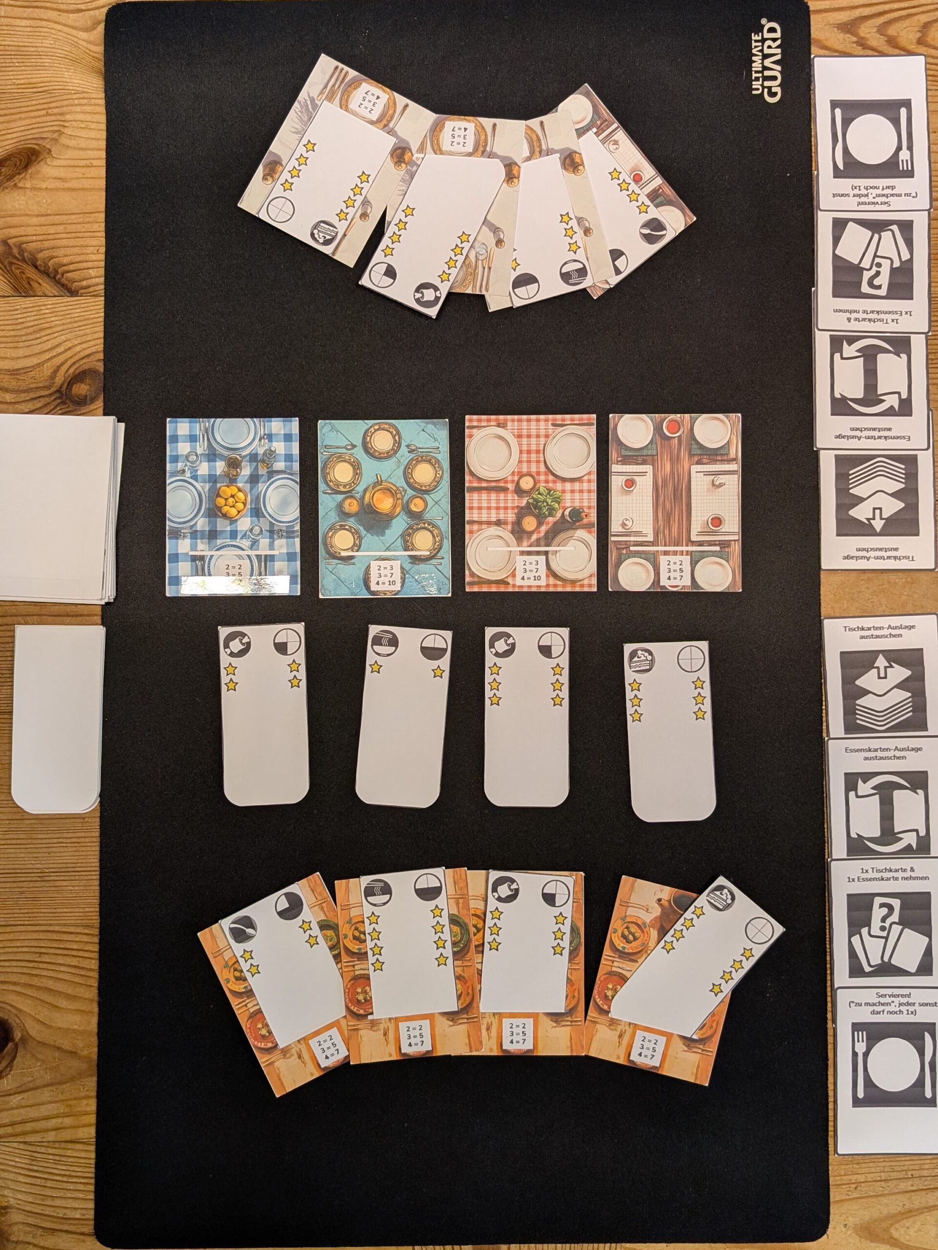 Die Karten werden in zwei Stapel mit einmal Tischkarten und den Tellerkarten aufgeteilt. Der Spieler, der zuletzt gekocht hat, mischt beide Stapel und teilt aus. Jeder Spieler erhält 4 Tischkarten und 4 Tellerkarten. Danach werden 4 Tisch- und 4 Tellerkarten gezogen und in je eine Auslage nebeneinander auf den Tisch gelegt. Die Spieler sind reihum dran. Wenn an der Reihe, kann ein Spieler entweder eine Tischkarte oder einen Tellerkarte aus seiner Hand mit einer ausliegenden der entsprechenden Sorte tauschen. Vor oder nach einem Kartentausch können Spieler auch 1x pro Runde eine Sonderkarte (Tisch &T eller tauschen, Tisch- oder Tellerauslage austauschen) nutzen.